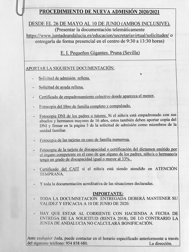 PROCEDIMIENTO DE ADMISIÓN CURSO 2020 / 21 EN LA ESCUELA INFANTIL PEQUEÑOS GIGANTES