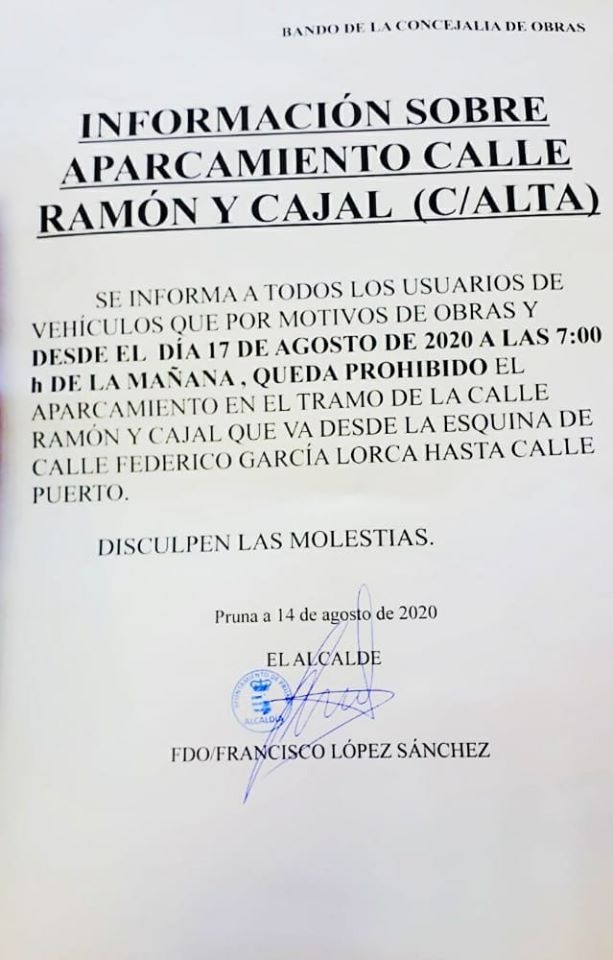 BANDO: INFORMACIÓN SOBRE APARCAMIENTO CALLE RAMÓN Y CAJAL (C/ALTA)