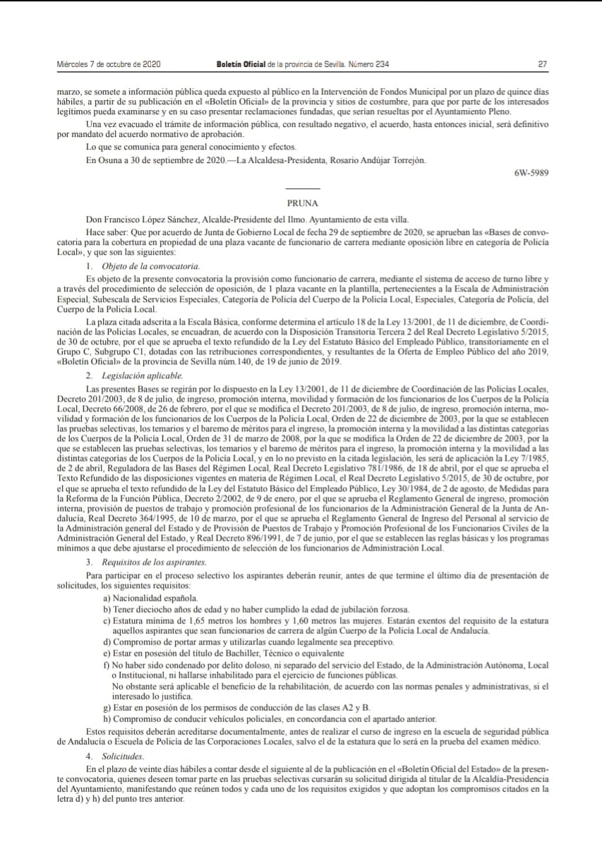 Hace varias semanas procedimos a la aprobación de las bases de una convocatoria para cubrir una plaza de Polícia Local. Dichas bases han sido publicadas hoy en el BOP (Boletín Oficial de la Provincia), donde cualquier persona interesada puede consultarlas.