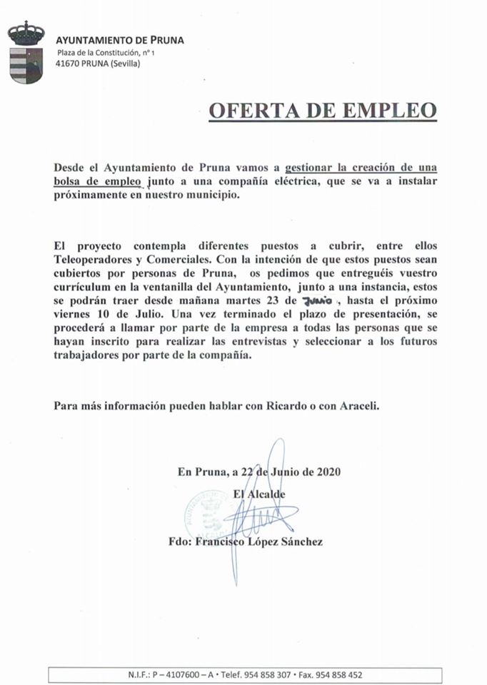 El proyecto contempla diferentes puestos a cubrir, entre ellos Teleoperadores y Comerciales. Con la intención de que estos puestos sean cubiertos por personas de Pruna, os pedimos a todas aquellos vecin@s que estéis interesados, que entregueis vuestro currículum en la ventanilla del Ayuntamiento, junto a una solicitud que hemos preparado, estos se podrán traer desde mañana martes 23 de Agosto, hasta el próximo viernes 10 de Julio. Una vez terminado el plazo de presentación, se procederá a llamar por parte de la empresa a todas las personas que se hayan inscrito para realizar las entrevistas y seleccionar a los futuros trabajadores por parte de la compañía.